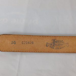 Silvertone buckle with five punched holes. The belt has a date inside which Is hard to read and either 2004 or 2014.