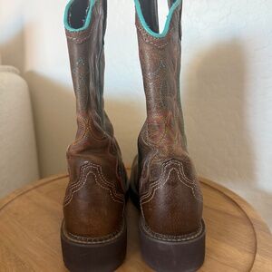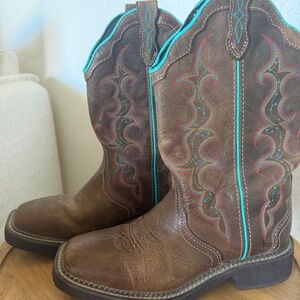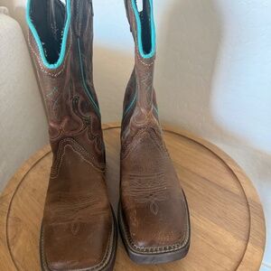 These Justins have been worn maybe 3-5 times. They are a mid-calf boot, real leather, squared toe with turquoise piping. Just need a good leather shine done on them. Size 7.5 B.