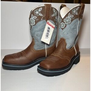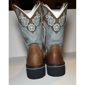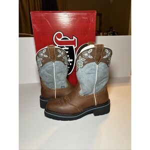 The product is a pair of Justin Women's Western Boots in size 7.5, featuring a stylish brown color with turquoise accents. These boots are designed with a Western cowboy theme, making them perfect for adding a touch of authenticity to any outfit. The Justin Boots brand is known for their quality and craftsmanship, ensuring that these boots are not only stylish but also durable for long-lasting wear.