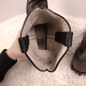 These Justin black leather ROPER Western Cowgirl Boots are designed for women in a size 5 1/2 D. With a mid-calf shaft style and pull-on closure, these boots feature a solid pattern with a classic round toe shape. The low heel height and leather lining and upper materials make them suitable for casual occasions, showcasing a Western style perfect for everyday wear.