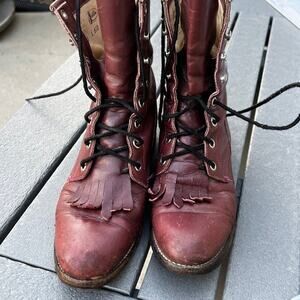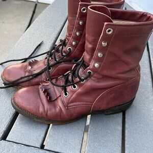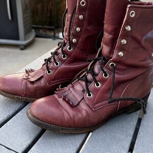 *Vintage 1980’s burgundy women’s 6 1/2B Justin Roper boots. Fringe on front. Round laces. Made in USA. Leather