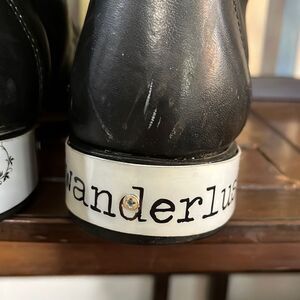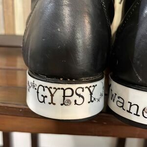 Amazing unique version of the Hiram kiltie black leather with heel accent boots. Wanderlust and gypsy attached to each heel add a flair to the badass boots