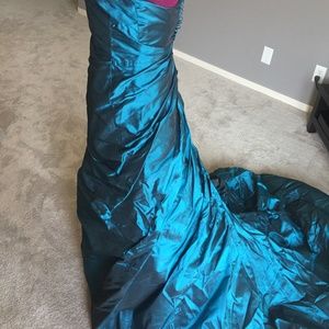 Made to order, this Justina Mccaffrey couture teal ballgown is truly one-of-a-kind. I found the dress in white and special ordered it in teal for my wedding. Excellent condition, warn once. This breathtaking wedding gown is simple in front (great paired with fabulous jewelry) and a show stopper in back. The mermaid-style train bustles with color coded ties. Fully corseted with two width options. Size 2.