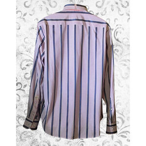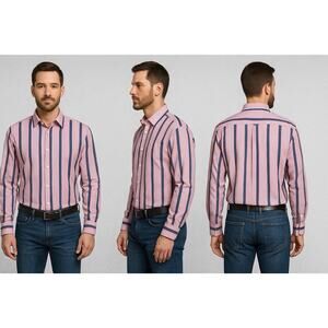 Justin's Boutique Mens XL Tailored Fit Gingham Stripe Contrast Cuff Button Shirt. Cotton shirt with a medium weight feel. Pair with Jeans for a dress casual night out. Easy to pair with a Sports Coat for a Social Event or Polished Workwear. Boutique button down shirt with a contrasting cuff in light pink with Navy and Gold stripe. Pairs well with darker colors.