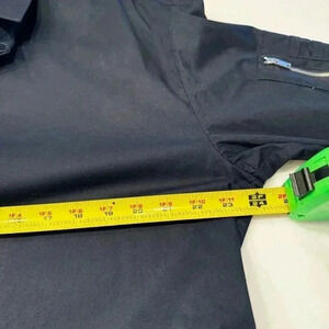 The shirt is in excellent condition. Navy blue button down, long sleeves, arm zipper and covered front buttons. Please see photos for measurements