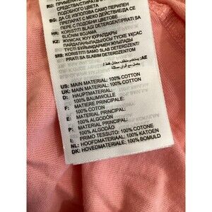 Notes: Interior neck print shows size grid; care label confirms 100% cotton