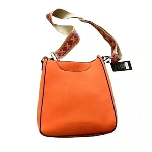 K Carroll neoprene messenger/crossbody bag, orange with adjustable guitar strap, snap closure, 2 inside pockets, front outer pocket, resistant to water, oil and heat, rfid protection 11”x10”x 3”, NWT