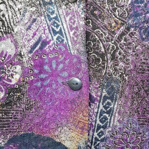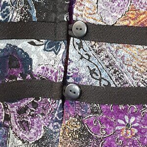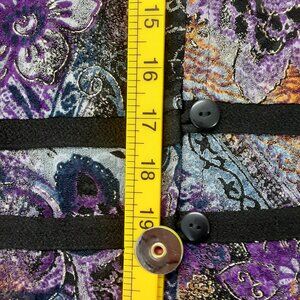 K & Company Woman's Jacket Size 16, Designer Split Back, Shoulder Pads. Beautiful jacket with black, purple and gold colors. Perfect for business. Measurements and pictures are taken of each garment/item and are included in the listing. Item is free from stains, rips or observed issues unless otherwise noted in listing.