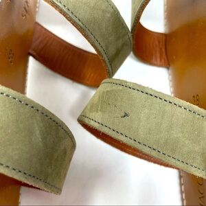 Step into timeless style with these K. Jacques all-leather sandals. Expertly crafted in France, these flat slip-on sandals feature two elegant leather straps across the foot in a versatile green khaki hue. A perfect blend of minimalism and craftsmanship.