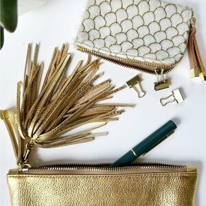 Elegant gold clutch with a stylish tassel accent. Perfect for any occasion. Like new, clean interior. Tip pouch retails for $108, pom tassel retails for $35. No longer available. Please see vendor’s IG for additional photos. I believe this color was called platinum.