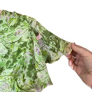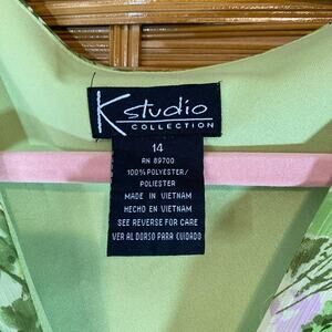 Vintage-inspired K Studio Collection dress in size 14. Features a dreamy green and lavender floral print, flattering twist-front waist detail, and flutter split sleeves. The A-line silhouette and lightweight polyester chiffon make this the perfect piece for spring, summer, weddings, or garden parties. Truly a Y2K gem with timeless feminine charm.