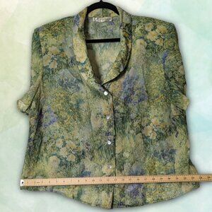 This is a beautiful vintage sheer short-sleeve button-down blouse from the brand K Studio, featuring an all-over watercolor floral pattern reminiscent of a Monet painting, with green, yellow, and blue tones. The style is classic 90s, with a relaxed fit and a soft collar. While the size and care tags are missing, the measurements suggest it fits like a size Large or Extra Large (approx. women's 14/16).