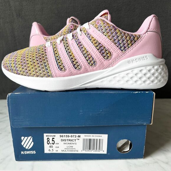 K Swiss District women's size 8-1/2 sneakers are new in box. Pink with rainbow colors; white laces and outsole.