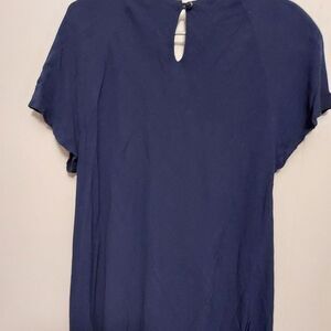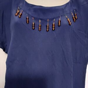 Navy blue short sleeve blouse with shoulder pads VGC has one button closure in back round collar with beading Dry clean. Made in USA light weight slits on both side for easy movement