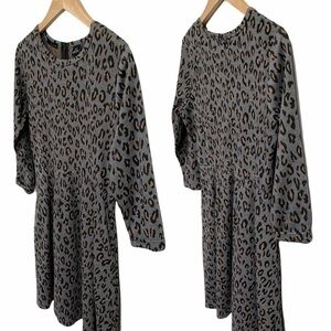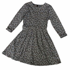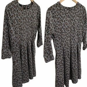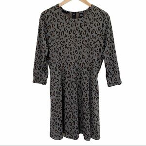 Grey leopard print sweatshirt skater dress by K by Kersh. Fit and flare flattering silhouette. Neutral grey background with all over tan and black animal print. 3/4 length sleeves with rolled cuff; back zipper with hook and eye closure; two pockets; unlined. In excellent used condition.