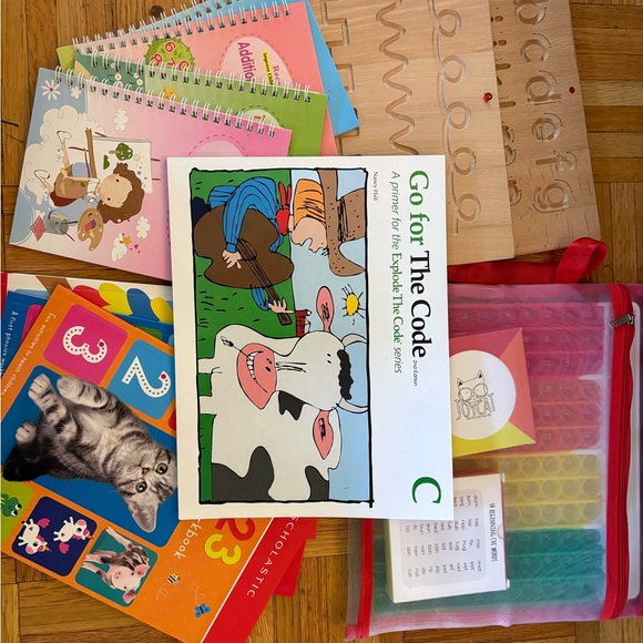 Set of educational activity books and tools. Includes colorful books and learning aids. See pics for what’s included. None of the books are written in. The tracing boards are smooth wood.