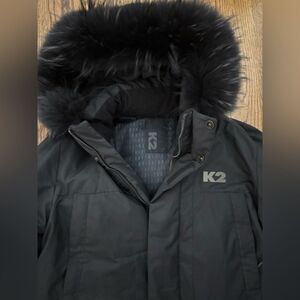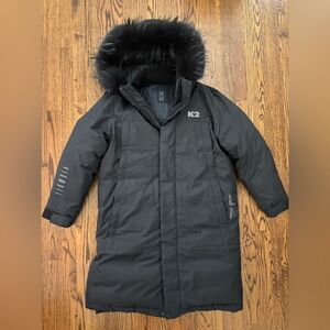 K2 Korea heavy down ski winter snow genuine fox fur trim hooded coat XL unisex