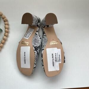 The Tallinn snake heels Snake embossed leather shapes a crisscrossing peep-toe upper, while a matching wrapped flared block heel finishes the look. Slide-on design.