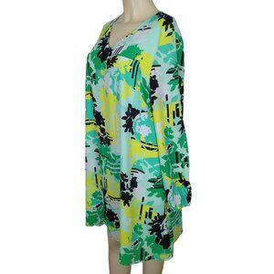 KAARI Blue V-Neck Long keyhole Sleeve yellow green abstract print Dress Size L