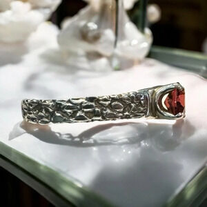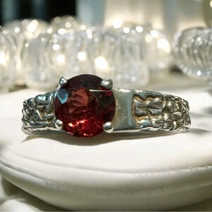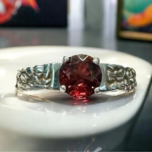 Gorgeous genuine solitaire pyrope garnet set in a beautiful, pebbled texture sterling silver band. Made by the renowned jewelry company, KABANA.