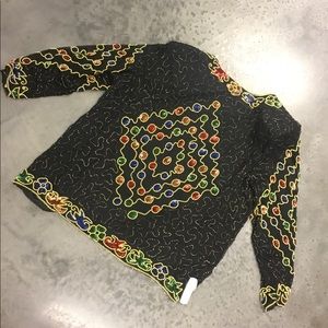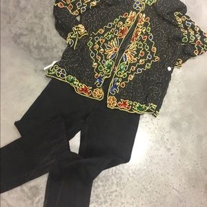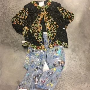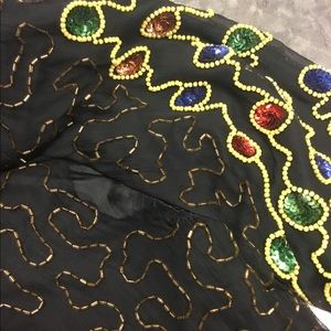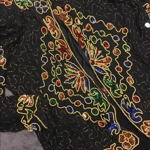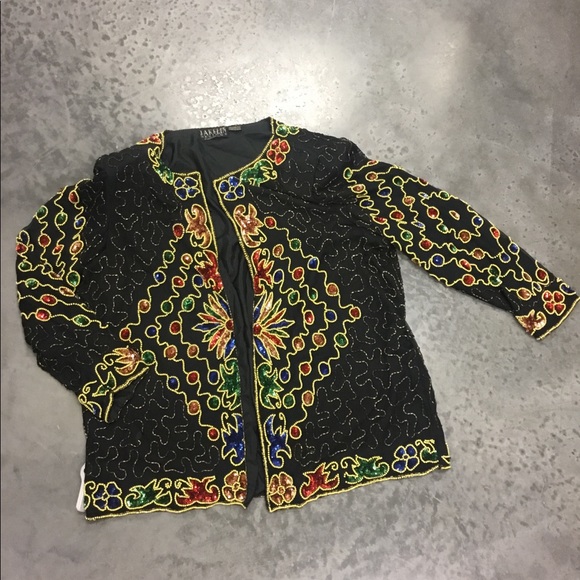 This Jakelin Design is a show stopper! Multi colored sequins is beautifully hand sewn and has a silk lining and shoulder pads. Slight tear in arm seam, but is an easy fix. Dress it up or down, heads will turn either way. 3x, Measurements are taken flat... Bust23.5”, Length 28.5”, Sleeve 23”