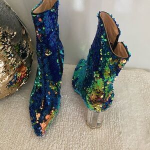 Make a statement in these so cool sequined booties featured in two-tone design that changes as you touch and a stunning lucite heel