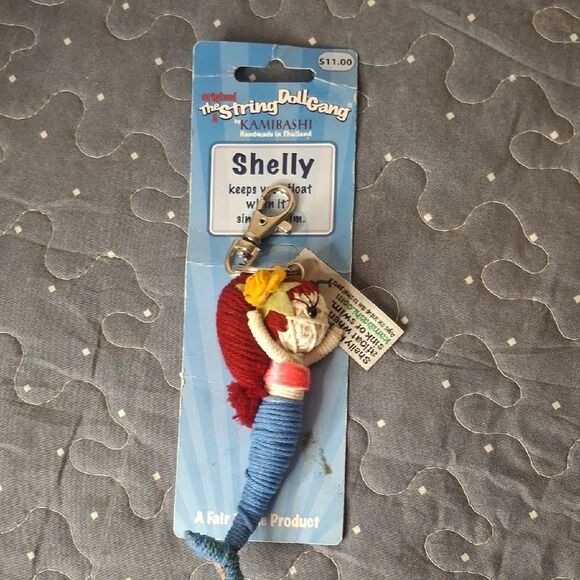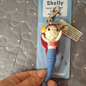 Colorful KAMIBASHI string doll keychain featuring Shelly. Red, blue, and yellow accents.