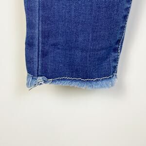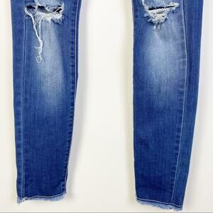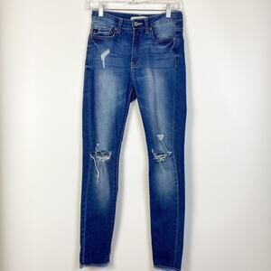 KanCan women's skinny jeans in medium wash blue. Distressed knees. Raw cuff. Size 26. Excellent used condition. No flaws detected. See measurements for fit.