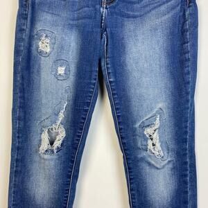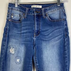 KanCan distressed skinny jeans in mid wash blue. Five pocket style with zip. Skinny cut. Style MT1025. Size 26. Excellent used condition. No flaws detected. Please check measurements provided for fit.