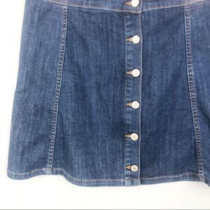 Adorable blue denim mini skirt by KanCan! Silver buttons up the front of the skirt. Slight stretch. Great condition! Size 10.