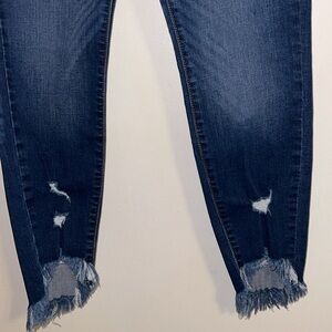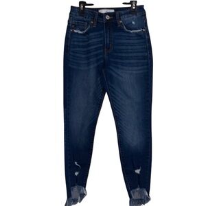 Stylish dark blue distressed jeans for women. Perfect for a casual look with a trendy edge. Comfortable fit and versatile style.