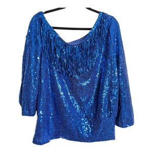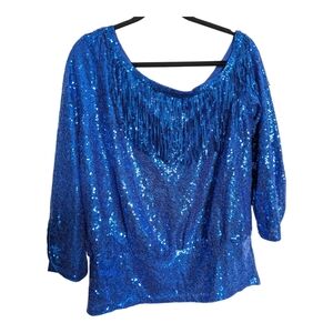 KANCY KOLE Blue Sequin Fringe One Shoulder Top Sparkly Bell Sleeve