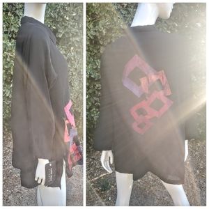 Loose fitting silk crepe blouse with applique designs on front and back. Semi sheer. Button front. NWT