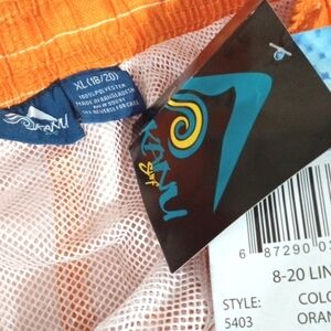 KANU BOYS RASHGUARD SWIM TRUNKS UPF50 Quick Dry Mesh Lining Adjustable Drawstring Two Front Pockets One Cargo Pocket Orange White Stripes Swim Trunks SIZE XL 18-20 NWT