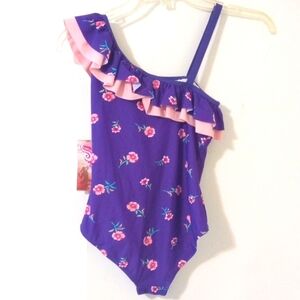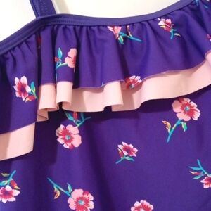 KANU SURF GIRLS OFF SHOULDER SWIMSUIT Purple Pink Floral Ruffle Trim One Piece Swimsuit SIZE 12 NWT