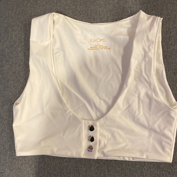 A cute sleeveless swim top with silver buttons to connect the front.
