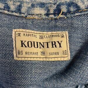 KAPITAL KOUNTRY long sleeve shirt in an indigo denim featuring a distressed design, Western style with two snap chest pockets, and snap closure. Made in Japan. Note: the sleeves on this garment have been professionally altered and are slightly uneven in length. Please double check measurements.