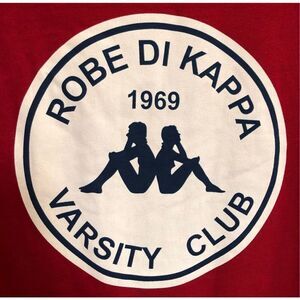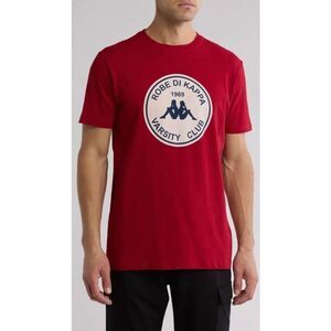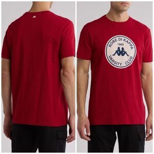 Kappa x Robe Giovani collaboration in men's size XXL. Giovani Mano Graphic Print T-Shirt in "Red Chili Pepper". Elevate your street wear game with this eye-catching graphic tee featuring a vintage-inspired print for a touch of nostalgia. It's 100% cotton, so machine wash (inside out) on low and hang to dry. It features Kappa's Omni Logo - a white circle graphic on the chest with the text "Robe di Kappa 1969 Varsity Club" and depicting a silhouette of a man & woman sitting back to back. A short sleeve, crewneck with the logo graphic centered at the chest. This heavy-weight jersey tee is made of breathable cotton with a small embroidered logo on the back neck. The brand is known for their retro sportswear aesthetic and association with European football. The pit-to-pit measurement is 27", the length is 33" and the sleeves are 10". Very soft, very nice and NWT!