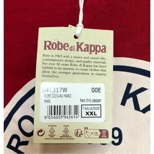 Kappa x Robe Giovani collaboration in men's size XXL. Giovani Mano Graphic Print T-Shirt in "Red Chili Pepper". Elevate your street wear game with this eye-catching graphic tee featuring a vintage-inspired print for a touch of nostalgia. It's 100% cotton, so machine wash (inside out) on low and hang to dry. It features Kappa's Omni Logo - a white circle graphic on the chest with the text "Robe di Kappa 1969 Varsity Club" and depicting a silhouette of a man & woman sitting back to back. A short sleeve, crewneck with the logo graphic centered at the chest. This heavy-weight jersey tee is made of breathable cotton with a small embroidered logo on the back neck. The brand is known for their retro sportswear aesthetic and association with European football. The pit-to-pit measurement is 27", the length is 33" and the sleeves are 10". Very soft, very nice and NWT!