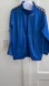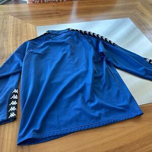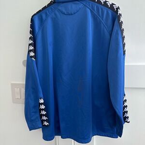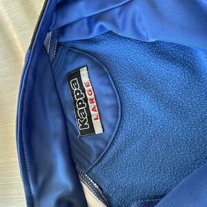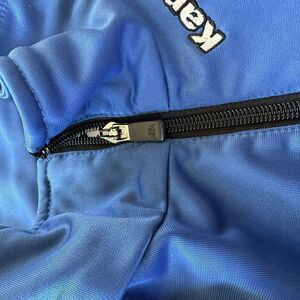 Kappa royal blue zip jacket with black-and-white logo on sleeves. Size large. Pockets. Great condition. Sleeves were professionally shortened to make it more comfortable. The sleeve length is 25 inches, the length is 28 inches, the waist measures 42 inches, and the bust measures 42 inches.