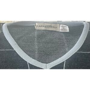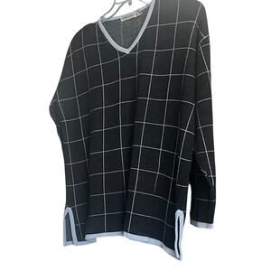 KAREN LESSLY LONG SLV V-NECK PULL-OVER SWEATSHIRT, WOMENS-L-GREY BLUE SQUARE GEO