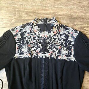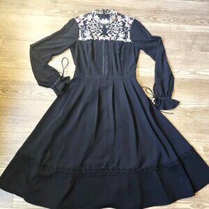 Beautiful Black georgette fabric with embroidered guipure lace yoke and mock neck. Pintuck details at bodice and sleeves. Fully lined. Back Zipper. Perfect condition!