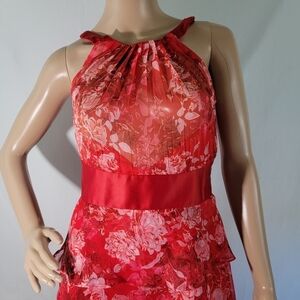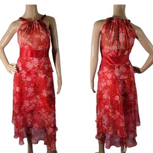 KAREN MILLEN Red Floral Silk Tiered Maxi Dress Sz 6 Halter Neck Sleeveless