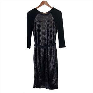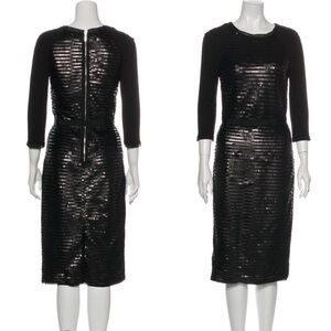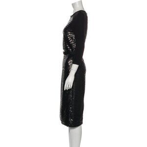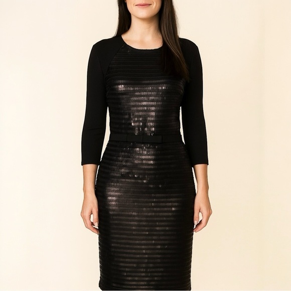 KAREN MILLEN Sequin Paillette Midi Sheath Dress. Three-Quarter Sleeve with Scoop Neck. Exposed Zip Closure at Back. Detachable belt with bow detail. Fully lined. Subtle monochromatic stripe pattern texture with unique long paillettes. Classic little black dress with a twist. All photos ARE of the actual dress for sale, except 1st photo.