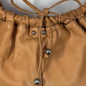 Details: Silver-toned studs are visible along the bottom edge and sides of the bag, providing a subtle embellishment. A leather drawstring closure at the top can be tied to secure the bag.
