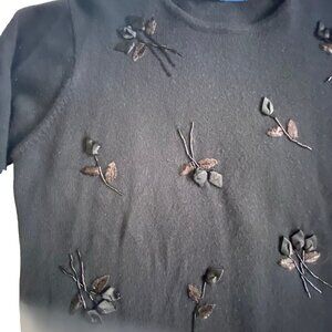 This elegant Karen Scott wool-blend sweater features hand-finished floral appliqués with satin petals, metallic thread embroidery, and beaded stems. The intricate 3D texture catches light beautifully against the soft black knit base — a timeless piece that blends vintage charm with cozy sophistication.