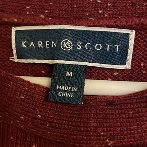 Karen Scott women's crew neck sweater is a merlot color with white flecks throughout. It features long sleeves and a curved hem, consistent with a pullover style. The size is clearly marked as Medium on both the neck and hang tags. The sweater shows no visible signs of wear or imperfections. 60% Cotton and 40% Acrylic