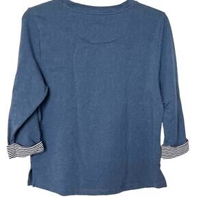Cute stylish blouse - heavier material for cooler weather - Fall, Winter & early Spring - pairs nicely with a skirt, slacks, jeans for casual activities! Adorable long sleeves & inside back neckline are designed with vertical Navy Blue & White stripes & roll tab sleeves; round neckline; Cotton/Spandex fabric blend provides for a good amount of stretch; back yoke; 3" vent/straight hem to strengthen the shirt at the point of stress