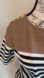 Stylish women's top featuring bold black and white stripes with a chic brown accent. Perfect for casual outings or a day at the office.