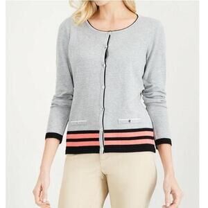UPC: 732994466530 Karen Scott's tipped cardigan is the essential sweater at its most classic, with its relaxed fit and gleaming buttons down the front and trimming the faux pockets. Approx. model height is 5'10" and she is wearing a size medium Relaxed fit; hits at hip; approx. 24" long Due to generous sizing, we suggest sizing down for the perfect fit Tipped crew neckline and button-front closure Tipped faux pockets with button trim; striped hem Rayon/polyester Machine washable
